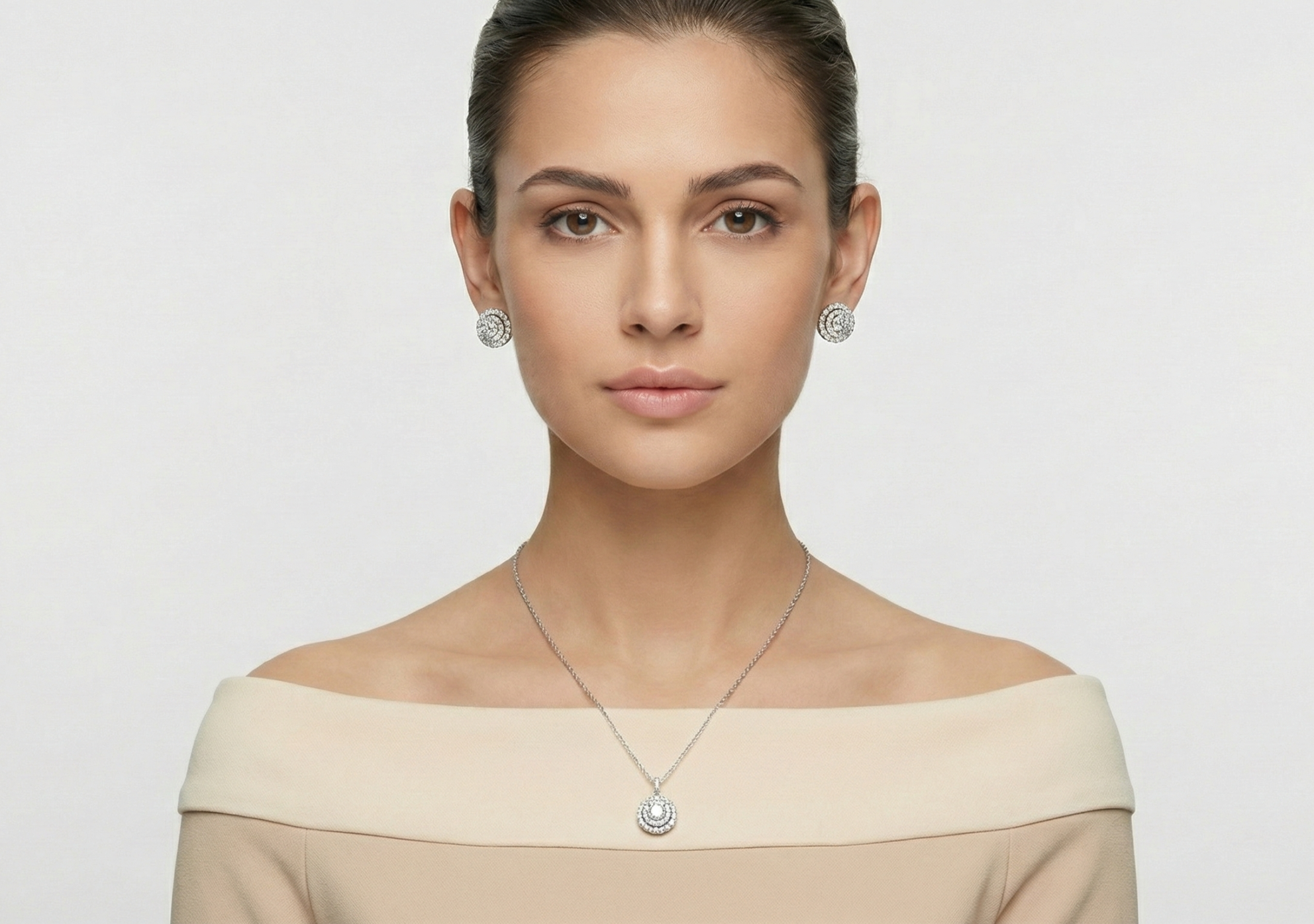 • The Orbital Architecture: Both the pendant and earrings are designed with a brilliant central stone encircled by two distinct, concentric rings of shimmering pavé-set accents. This creates an “orbit” effect that provides incredible depth and a continuous sparkle.