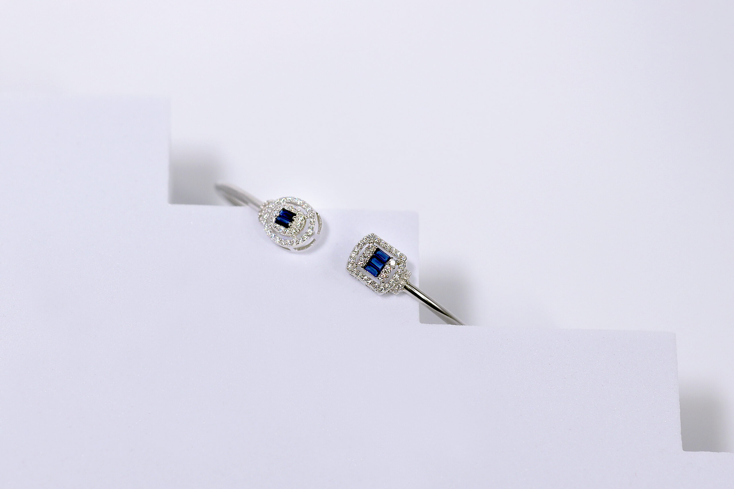 Where bold geometry meets timeless grace. The Bleu Sapphire Verge Bracelet commands attention with twin centerpiece caps: one round, one angular — both encrusted with icy white stones and radiant baguette-cut blue sapphire tones. A sculptural statement in pure 925 sterling silver.