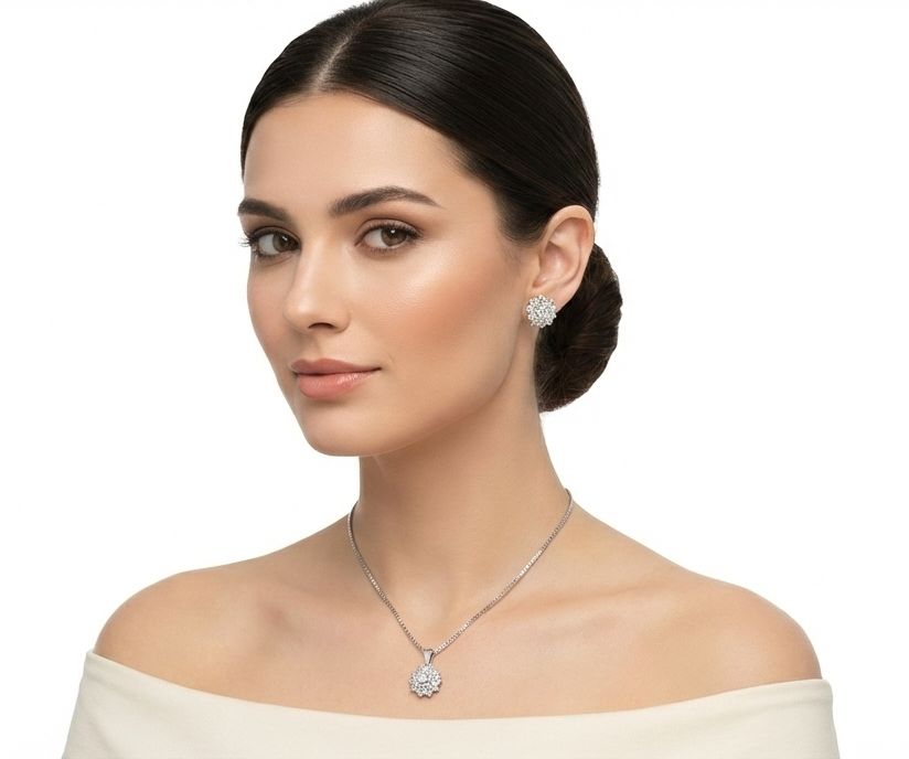 Coordinated Majesty: This combo includes a delicate silver chain and matching eternity-style earrings, offering a perfectly balanced look that draws the eye to the face and neckline.