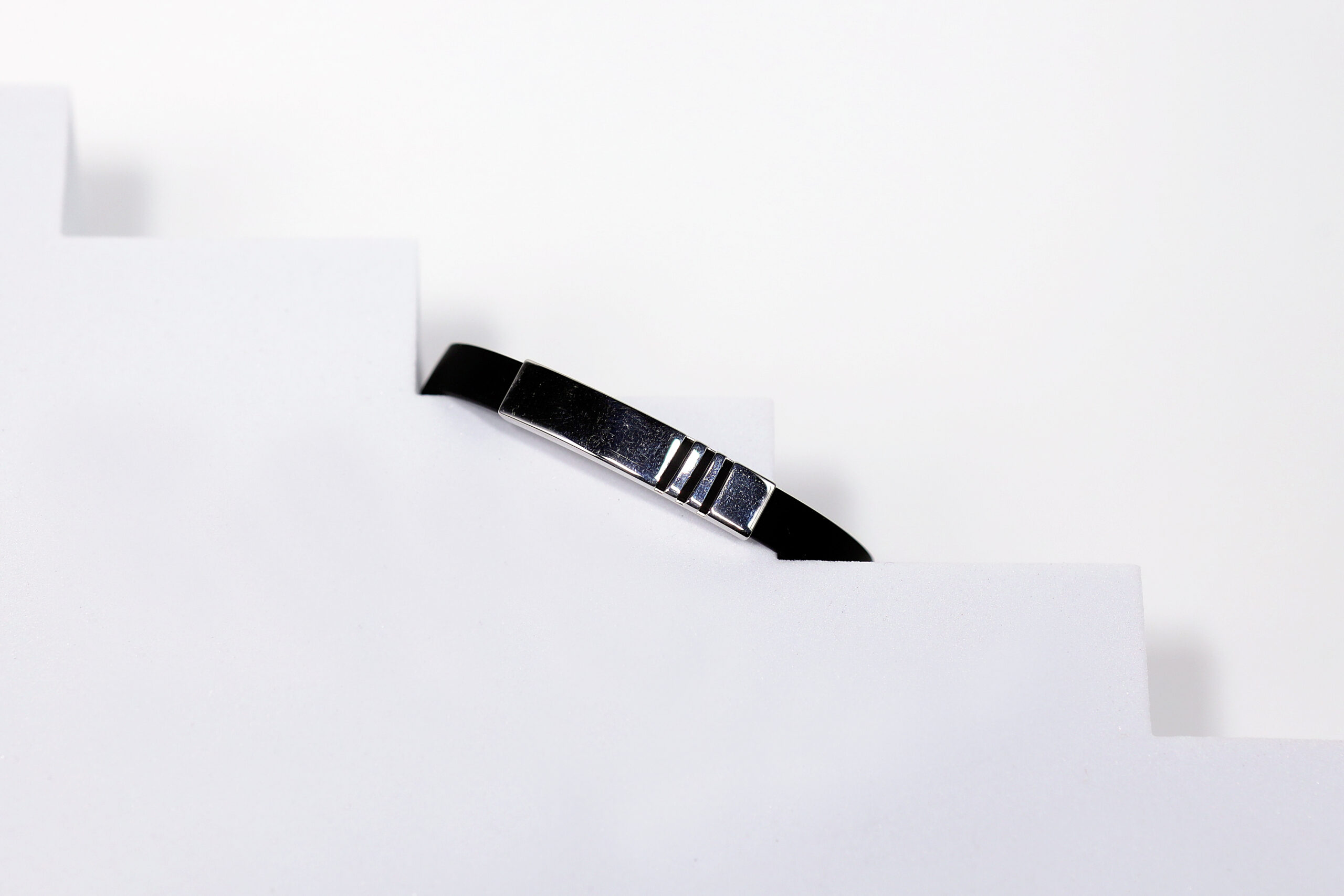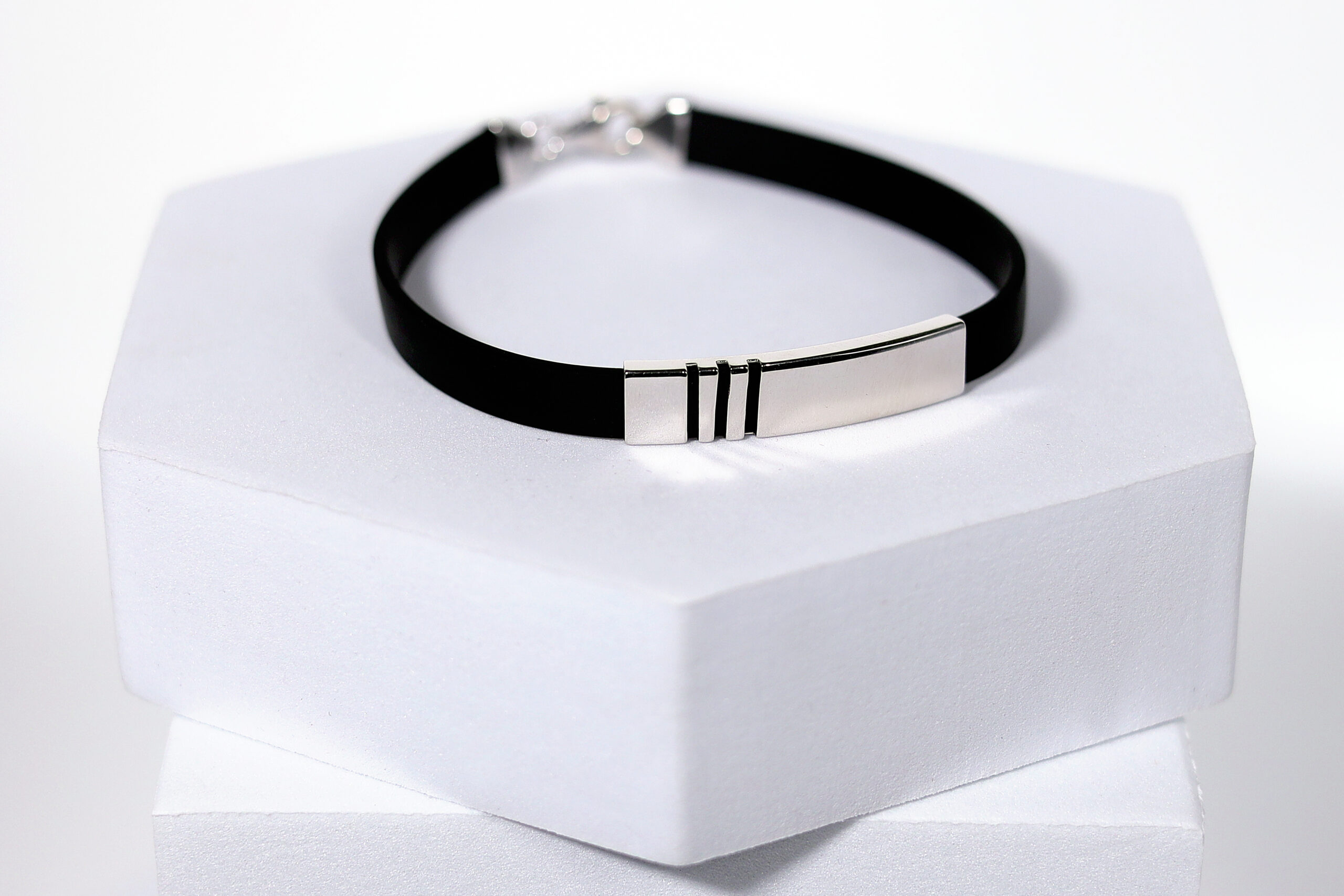 Command attention with clean lines and bold contrast. The Ecliptor III Bracelet features a jet-black band and a smooth, high-polish pure 925 sterling silver plate accented with three precision-cut grooves—symbolizing balance, clarity, and forward motion.