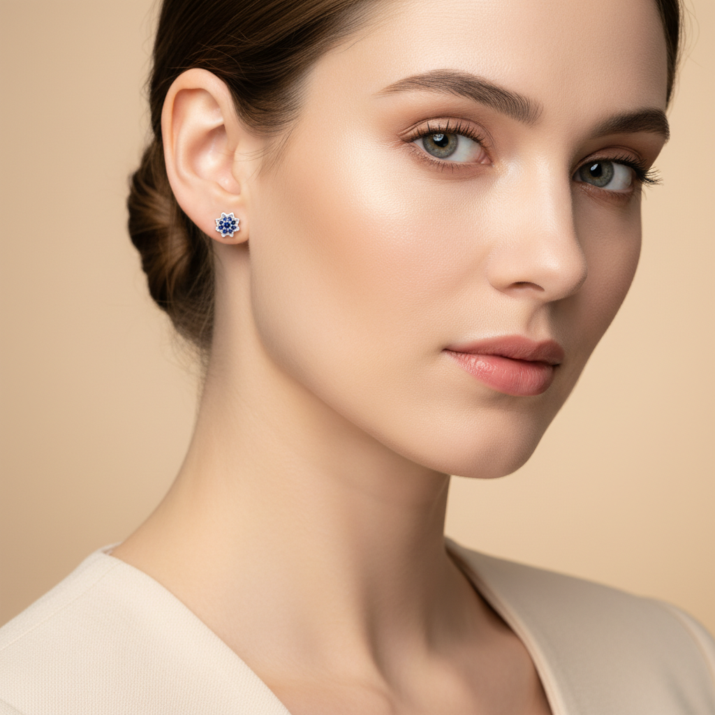 The Sapphire Flower Stud Earrings in pure 925 silver bring a calm, refined sparkle—perfect for women who love understated beauty with a touch of luxury.