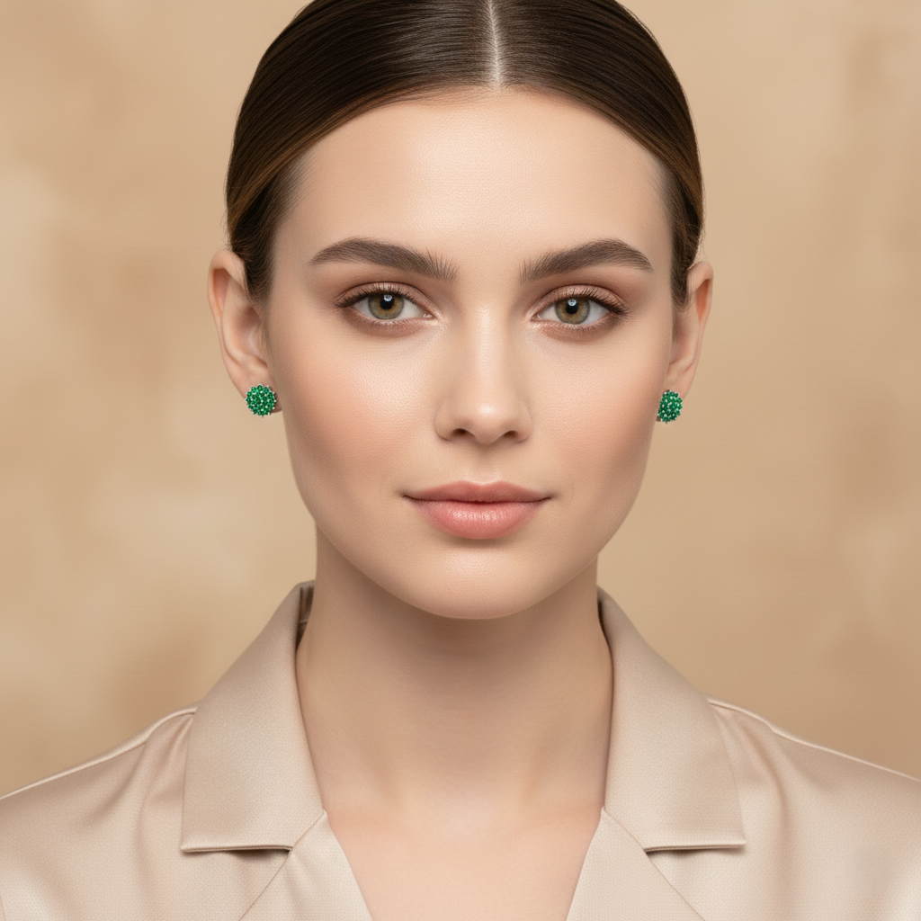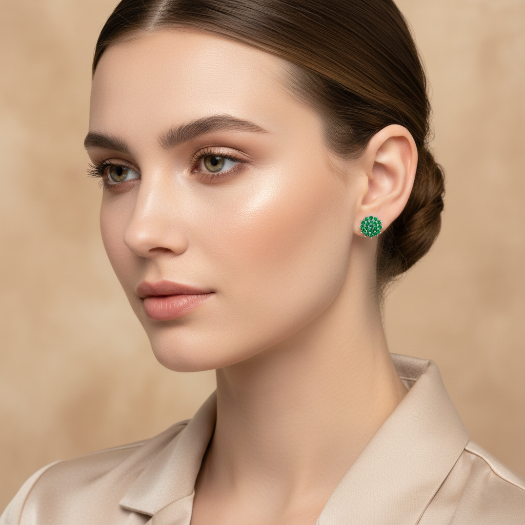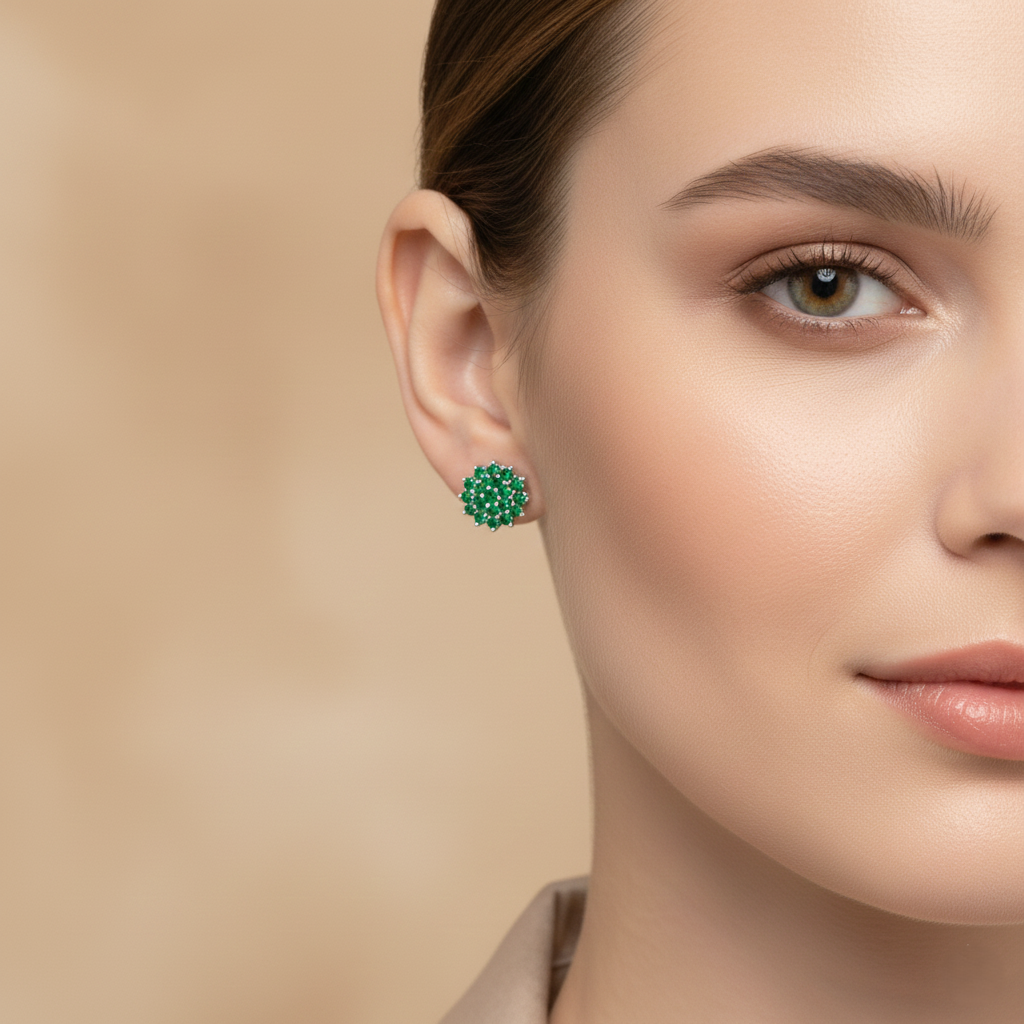 The Green Emerald Pavé Cluster Stud Earrings in 925 silver bring refined sparkle and natural elegance to every moment.