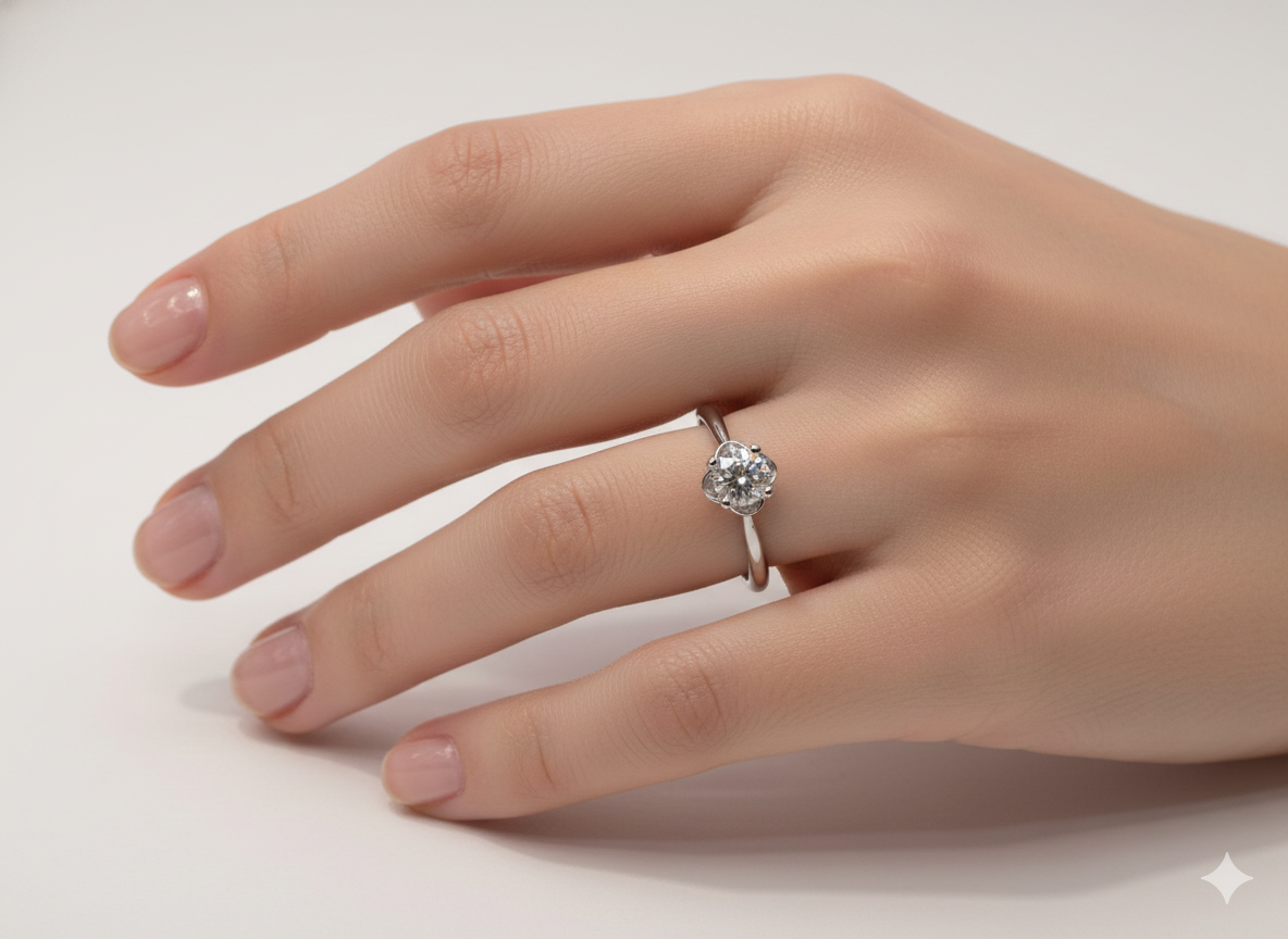 Botanical Silhouette: The centerpiece features a brilliant round-cut stone held within a unique four-prong setting that mimics the shape of a blooming clover or a delicate flower.