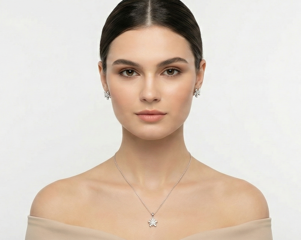 Coordinated Design Language: The set features a perfect 1:1 match between the pendant and the studs, ensuring a cohesive and polished aesthetic that frames the face and neckline with consistent brilliance.